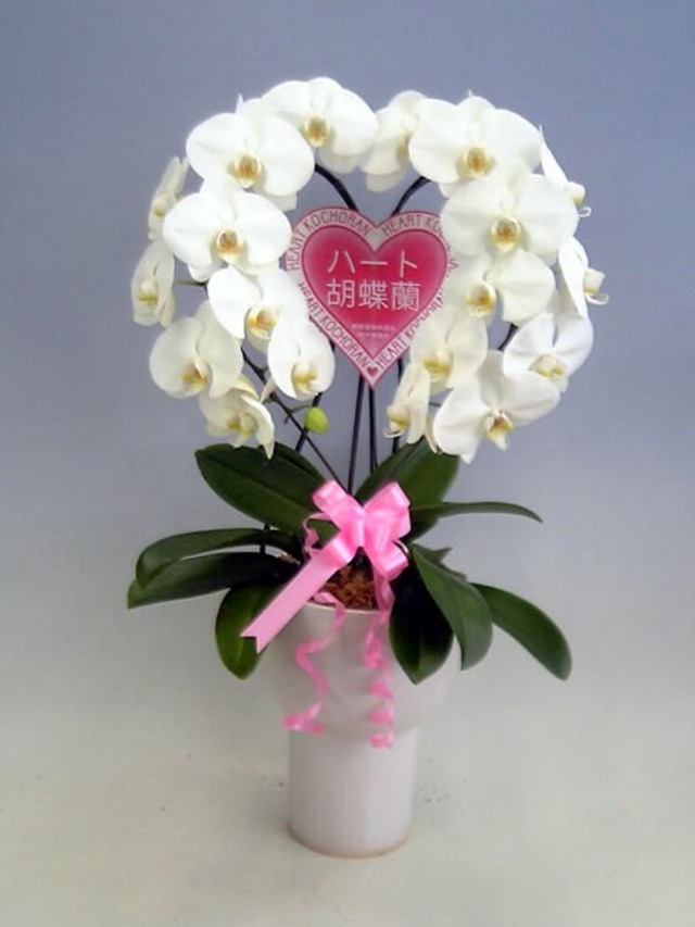 (注)お花の咲き方や樹形には個体差がありますので写真とは多少の違いがあります。 ※ご注文状況や成育状態により在庫が変動いたします。まれにご希望の商品が手配できない場合がございます。予めご了承ください。※その場合はご連絡の上ご相談させていただきます。 取扱期間:★限定受注生産につき 在庫の関係でお時間をいただく場合もあります。 通年 ※ご注文状況や成育状態により在庫が変動いたします。まれにご希望の商品が手配できない場合がございます。予めご了承ください。※その場合はご連絡の上ご相談させていただきます。 特長 ★ハート仕立てにした可愛らしい胡蝶蘭です。 花持ちがとても良いです。 ハートのラベルが花を引き立てます。 すべての商品に通し番号が付いております(ラベルの裏に商品を保障するシリアル番号が付きます)。 非常に手間で難しい通年の量産体制(生産ライン)がようやく整いました。 地元生産者の仲間のかたからの協力でできています。スズキラン園、松浦園芸、北谷園芸、OZオーキッド、中村洋蘭園 他 商標登録証 登録第5005396号 用途 結婚記念日、ご結婚祝い、結婚式場装飾、母の日、ホワイトデー、お誕生日、出産祝い、に最適!! 花の数:2本立ち 1本10輪以上 合計20輪以上 花の大きさ:横5-6cm程度 花の色:白 高さ:鉢下より45-50cm程度 鉢:陶器鉢 6.0号 取扱期間:★限定受注生産につき 在庫の関係でお時間をいただく場合もあります。 通年 北海道・東北・北陸・信越・栃木・群馬・山梨などの寒冷地へは、11月中旬から3月下旬までは凍結の恐れがあるために、発送不可とさせていただきます。<font color="#000000"> 花持ち予想:2ヶ月(季節、置く場所、管理によって変わります)栽培管理:冬場の水のやりすぎに注意してください。乾いたら与えてください。"